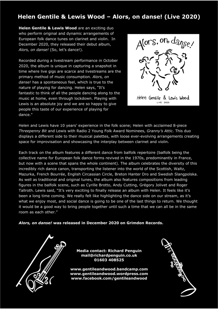 Helen Gentile & Lewis Wood are an exciting duo who perform original and dynamic arrangements of European folk dance tunes on clarinet and fiddle. The duo combines the talent of two musicians who are firmly embedded into the folk music community in England, with many festival credits between them. Mindful of the context of their music, the duo are sensitive in their performances, whilst also boldly pushing the boundaries of their musicianship, to keep the audience up on their feet!